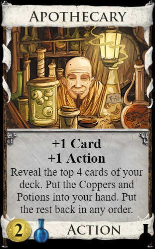| Apotheker | Pioche 4 cartes mais défausse les cartes tirées n'étant pas cuivres ou potions. |