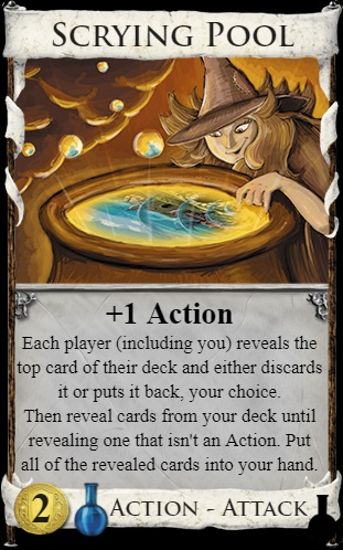 | Vision | Défausse (ou non) le dessus de la pioche de tous les joueurs et pioche jusqu'à ce qu'une carte autre qu'une action soit tirée. |
