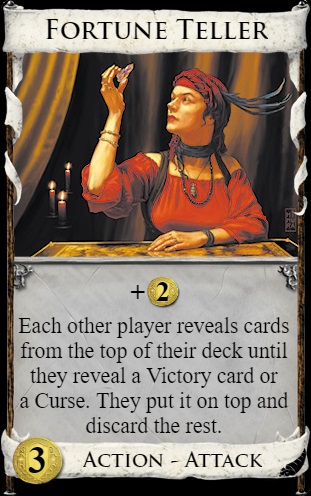 | Wahrsagerin | Défausse les cartes de la pioche des autres joueurs jusqu'à ce que la carte du dessus soit une carte victoire ou un Fluch. |